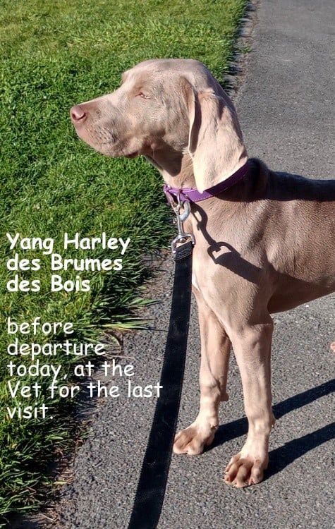 Les chiots sont habitués aux cages pour dormir et voyager, ils sont propres (éducation en continu) et font leurs nuits, ils ont un bon rappel, travail des mordillements à chaque changement de dents, ils attendent dans le panier, l'ordre pour manger, le "Pas Sauter" en continu, laisse à enrouleur ok, on va maintenant s'atteler au travail à la laisse courte et les ordres de bases les uns après les autres.